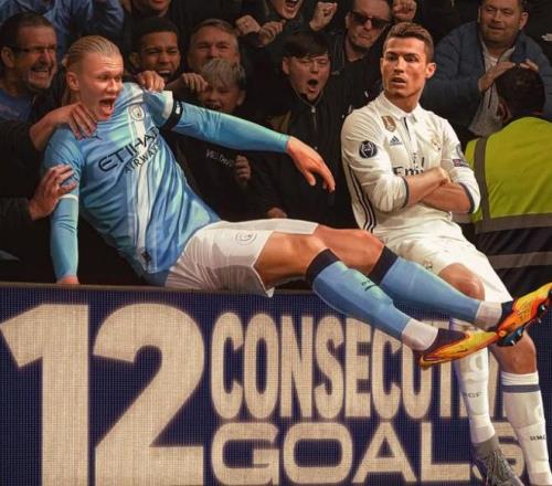 赛后根据统计,本场比赛的进球让哈兰德将自己在曼城和挪威国家队的连场进球纪录延续到了12场,他也就此追平了C罗职业生涯中最长的连场进球纪录。