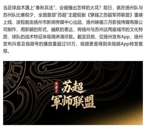 全国第一部"苏超"短剧《穿越之苏超军师联盟》,上线不到一周播放量破50万;83集的《苏超球王》,上线没多久就砍下近3000万播放热度。