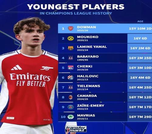 北京时间11月5日,在欧冠联赛阶段第4轮阿森纳客场3-0战胜布拉格斯拉维亚的比赛中,枪手年仅15岁的小将道曼第72分钟替补出场,并就此创造了欧冠历史最年轻的出场球员纪录。