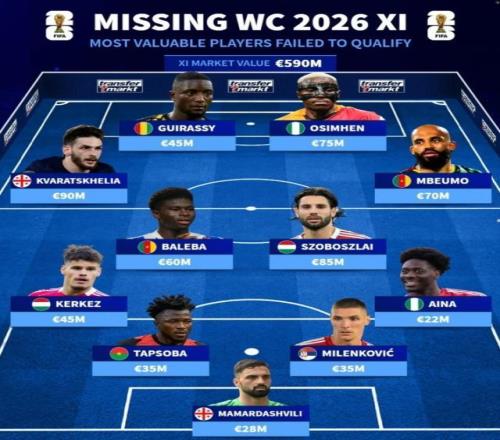 11月19日宣 德转社媒晒图,列出无缘2026世界杯球员中身价最高的首发阵容,奥斯梅恩、姆伯莫、K77、索博斯洛伊等多名球星在列。