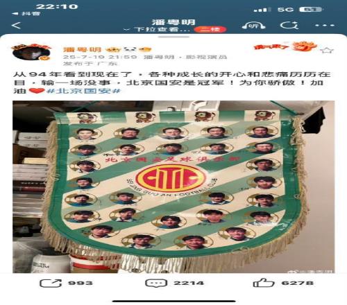 潘粤明堪称铁杆国安球迷,7月19日曾经发文表示,“从94年看到现在了,各种成长的开心和悲痛历历在目,输一场没事,北京国安是冠军!为你骄傲!加油。”
