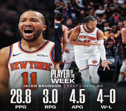 布伦森在上周率领尼克斯队取得了4战全胜的战绩,他本人在此期间场均可以得到28.8分3个篮板4.5次助攻的数据。